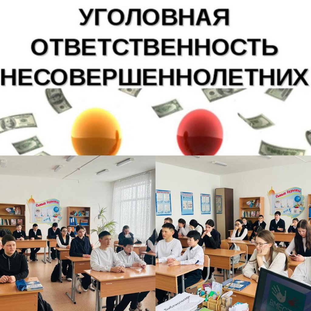 Кәмелетке толмағандар арасында құқықтық сауаттылықты арттыру және құқық бұзушылықтардың алдын алу мақсатында 5–9 сынып оқушыларымен «Кәмелетке толмағандардың әкімшілік және қылмыстық жауапкершілігі» тақырыбында әңгіме өткізілді.